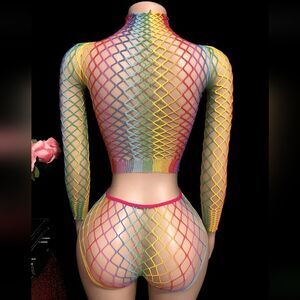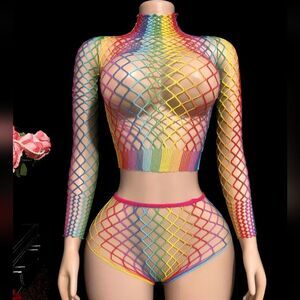 Vibrant and stylish, this multicolor mesh crop top and bottoms two piece cover up only is perfect for making a statement. The rainbow hues add a playful touch to any outfit.Bikini underneath isn't included.