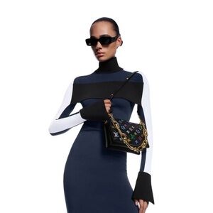 - Stylish crossbody handbag featuring a vibrant multicolored monogram on black.