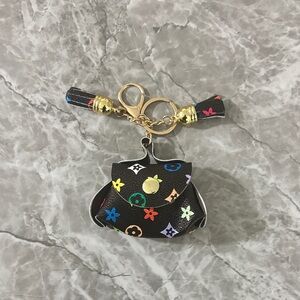 Stylish keychain pouch with multicolor monogram design. Features gold hardware and a secure clasp.