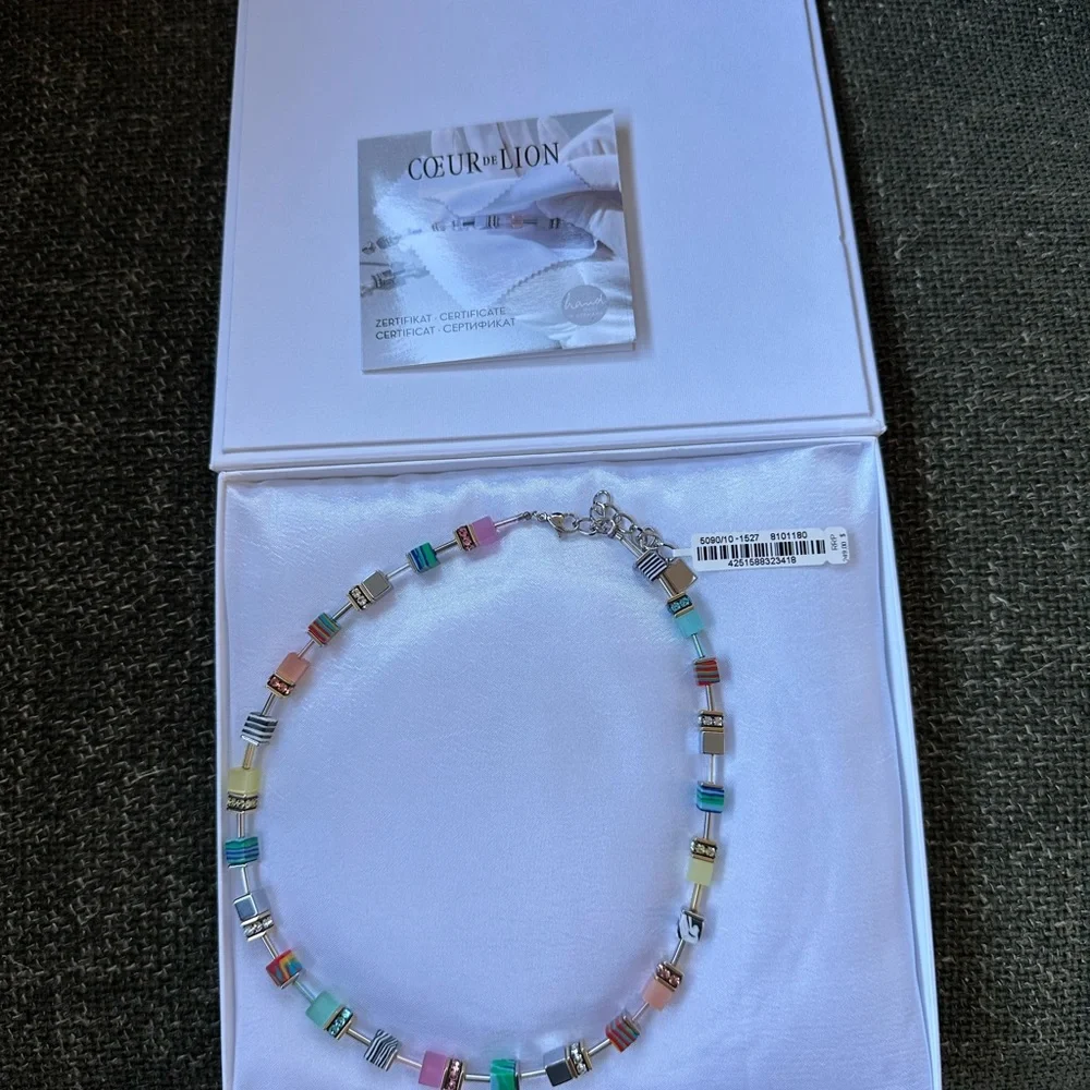 Elegant necklace featuring a vibrant array of colors. Perfect for adding a pop of color to any outfit.