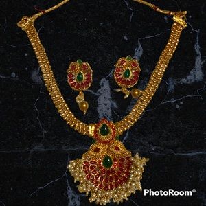Gold plated beads necklace set with red and green stones studded on it and white beads dangling from it. Comes with matching pair of earrings.