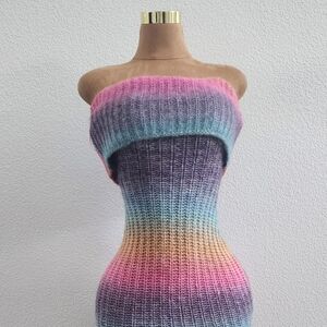 New! Embrace vibrant style with this multicolor off-shoulder knit dress. Perfect for any occasion, it features a blend of pink, blue, and yellow hues. Stand out with this eye-catching piece. Never worn.