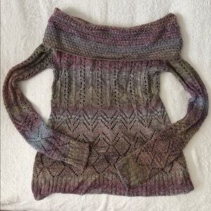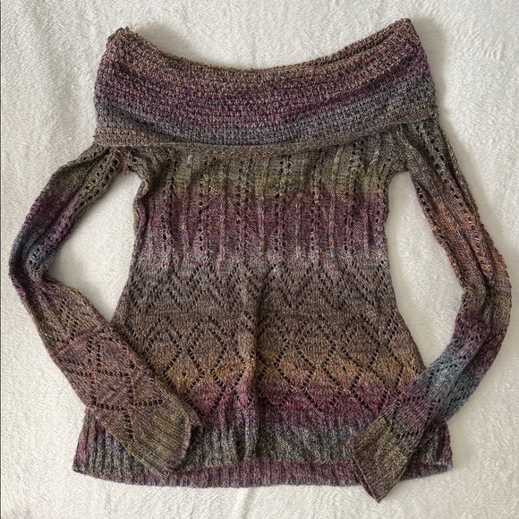 Stylish off-shoulder knit sweater with a multicolor pattern. Features shades of purple, brown, and gray.