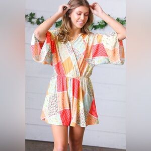 Brighten up your wardrobe with this multicolor bohemian paisley patchwork surplice flared shorts romper. With three quarter sleeves and made with a lightweight flowly challis woven material, get ready to look stunning.
