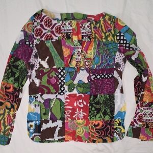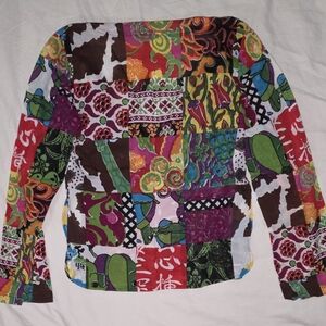 Vibrant multicolor patchwork blouse perfect for adding a pop of color to your wardrobe. Features a unique design with a blend of red, green, and purple hues.