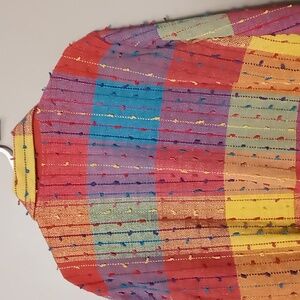multicolor patchwork jacket with vibrant block stripes. Lightweight woven fabric with metallic thread accents for subtle shimmer. Classic collar and button-front closure