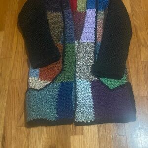 This is a unique, one-of-a-kind sweater that is hand knitted and hand-crocheted, making it a truly handmade piece with a gorgeous multicolor design. The long sleeves and cardigan style make it perfect for casual occasions during the winter and fall seasons.