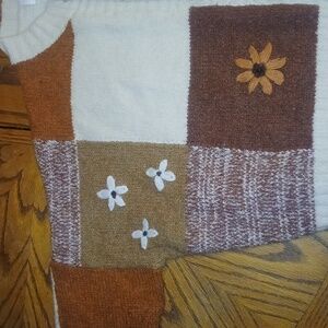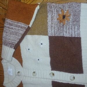 This cardigan features a charming patchwork design in cream, brown, and tan. Perfect for keeping you cozy and stylish.