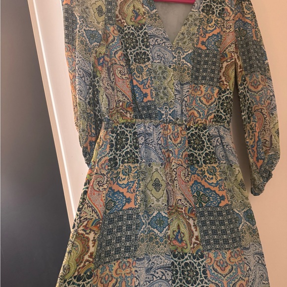 This vibrant multicolor patchwork dress is perfect for any occasion. Featuring a mix of blue, green, and orange patterns, it offers a unique and stylish look. Ideal for adding a pop of color to your wardrobe.