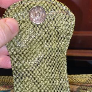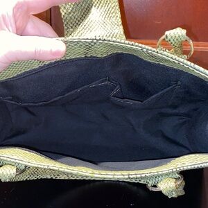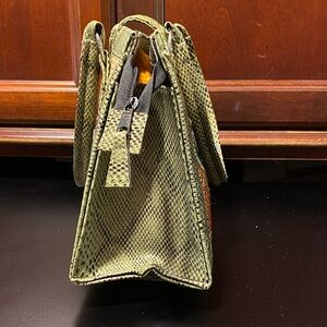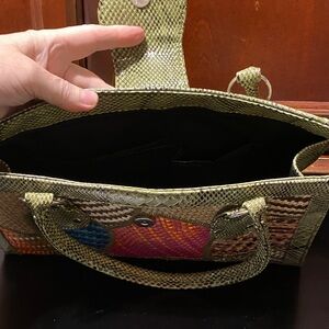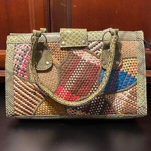 Stylish multicolor patchwork handbag with a unique design. Perfect for adding a pop of color to any outfit. 13 1/2” long x 5” wide x 8 1/2” tall, two handles 16” long, zipper across top and fold over with magnetic clasp closure. Inside has two open wall pockets.