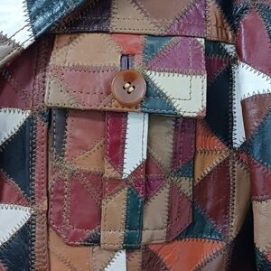 Stand out with this vibrant patchwork leather jacket, featuring a stunning array of colors for a unique look.