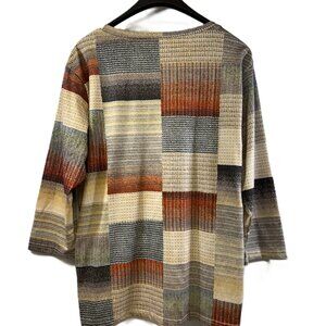 Elevate your wardrobe with this brand new (no tags) multicolor patchwork print long sleeve top. Designed with warm earth tones and a textured-style patchwork print, this statement piece combines comfort with an artsy, unique look. Made from a soft lightweight knit with a relaxed fit, it’s perfect for pairing with jeans, leggings, or casual work outfits.