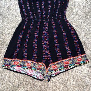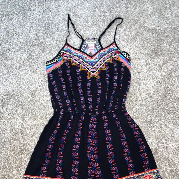 This is a Flying Tomato brand romper. This is a size S but feels like a XS. Thin material, minor V-neck and spaghetti straps. It is mainly a floral design romper. This is perfect for wearing over a swimsuit!
