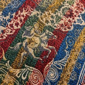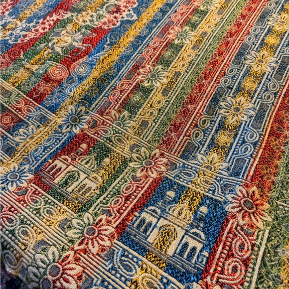 Rich, dramatic, and beautifully detailed this large 88” x 67” late-20th-century Indo-Persian revival jacquard tapestry blanket blends Mughal palace architecture with a romantic medieval equestrian rider, creating a striking “Old World” fusion aesthetic. 🏰🐎 The domed Taj-inspired silhouettes, scrolling floral borders, and heraldic mounted figure are woven directly into the fabric using textured jacquard construction, giving it a raised, almost brocade-like depth that feels far more luxurious than a standard throw. The saturated reds, royal blue, warm gold tones, and emerald green make it equally stunning as a wall hanging, statement bedspread, or oversized picnic blanket. Imagine a Mitra-in-the-garden moment laid out beneath open skies. 🌿☀️ Large enough to comfortably fit multiple people it’s both decorative and functional a conversation piece indoors and a regal picnic ground outdoors. Elegant, bold, and ornate, and functional
