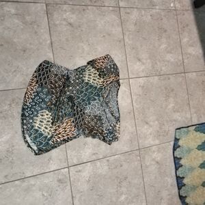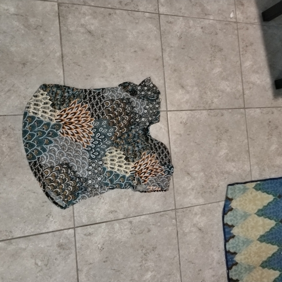 Stylish blouse with a vibrant multicolor pattern. Features shades of blue, orange, and black.