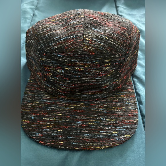 Stylish cap with a multicolor pattern. Features shades of red, yellow, and blue on a black base.