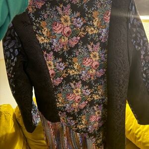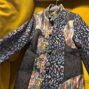 Stylish coat with a mix of vibrant patterns and colors. Features floral and abstract designs.