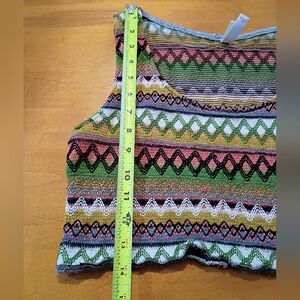 Vibrant and stylish, this multicolor patterned crop top is perfect for any casual outing. The intricate design features a blend of colors that add a playful touch to your wardrobe.
