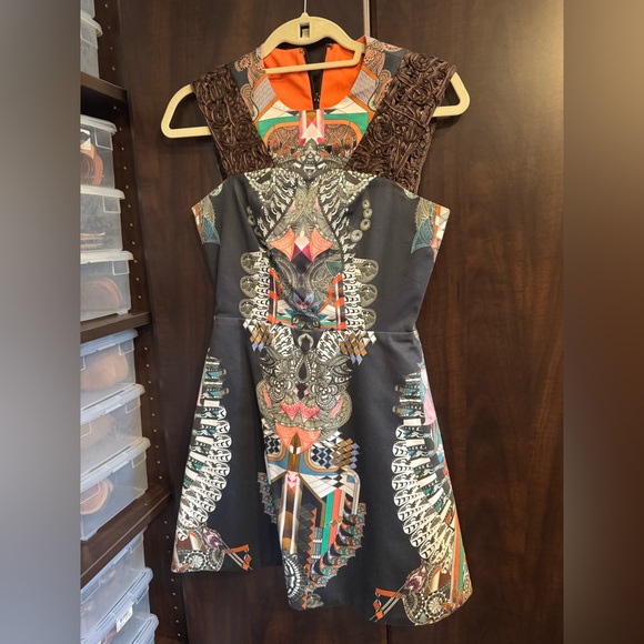Stylish dress with intricate multicolor patterns. Features a mix of brown, orange, and gray tones.