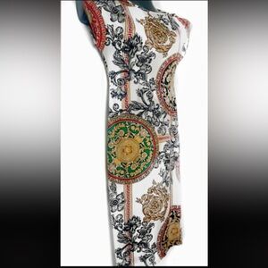 This elegant dress features a stunning multicolor pattern, perfect for any occasion. The intricate design combines shades of black, green, and gold, offering a unique and stylish look.