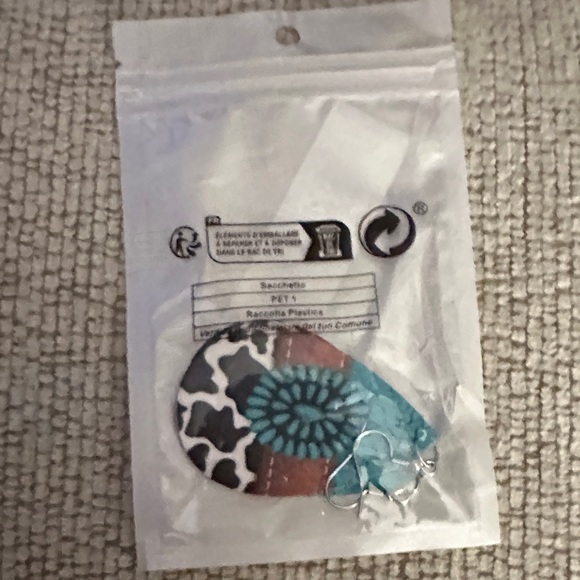 Stylish earrings with a multicolor pattern. Features blue, brown, and black designs.