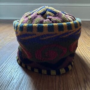 Stylish and vibrant, this multicolor patterned hat is perfect for adding a pop of color to any outfit. Featuring a blend of green, blue, and brown hues, it offers a unique and eye-catching design.