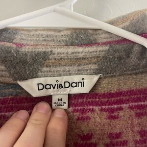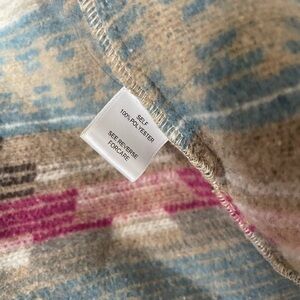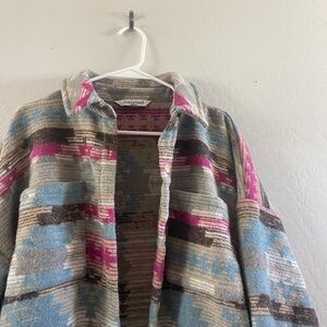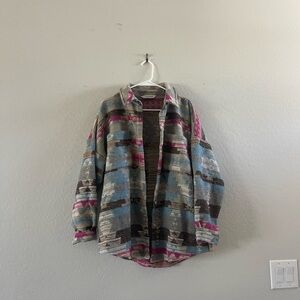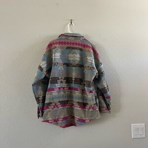 Stylish multicolor jacket with a unique pattern. Features shades of blue, pink, and gray.