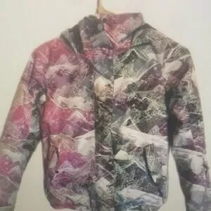 Stylish jacket with a vibrant multicolor pattern. Features shades of pink, green, and black.