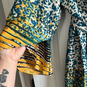 Stylish wrap dress with a vibrant multicolor pattern. Features a tie waist and flared sleeves.