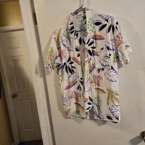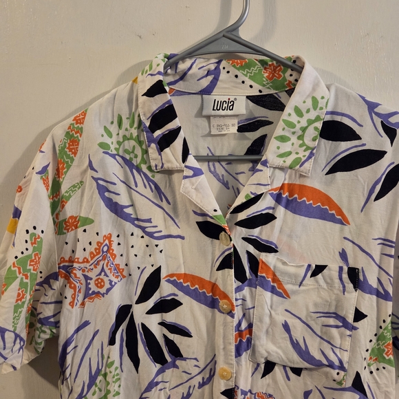 This vintage Lucia shirt features a vibrant multicolor pattern. Perfect for casual outings or an island vacation, this shirt combines style and comfort effortlessly. Size 14, fits like a Large.