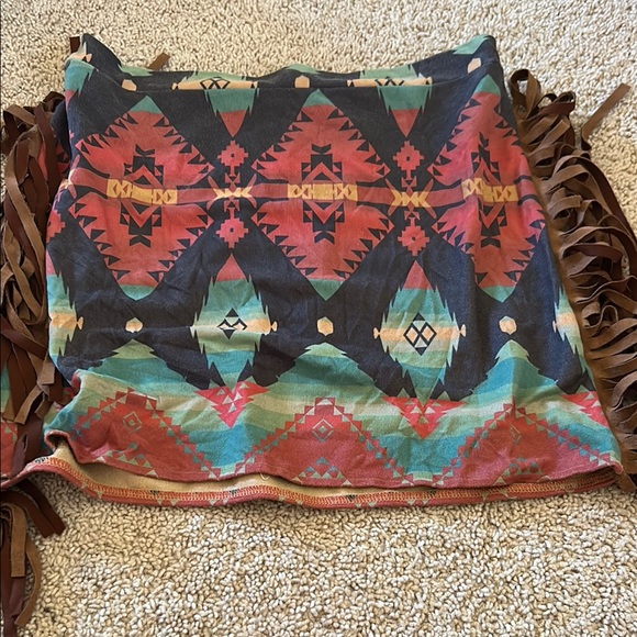 Stylish skirt with a mix of red, black, and teal patterns. Features unique design elements.great condition!