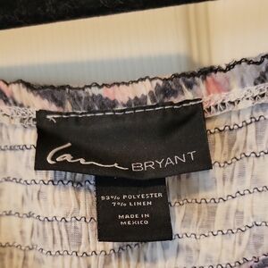Vibrant top with a mix of patterns. Features shades of pink, orange, and black.