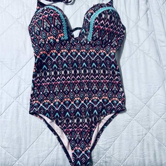 Stylish one-piece swimsuit with a vibrant multicolor pattern. Features a mix of pink, blue, and black hues.