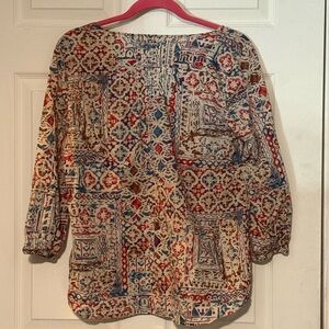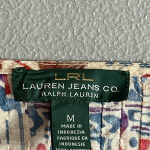 Lauren Jeans Company Ralph Lauren multi-colored peasant top. It features a vibrant pattern, sometimes described as tribal or geometric, with colors including red, blue, cream, and purple. The top typically has three-quarter length sleeves and is often made of cotton or a cotton blend.