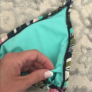 Stylish and vibrant, this multicolor patterned bikini top is perfect for your next beach day. Featuring a mix of black, green, and pink hues, it offers a chic and modern look.