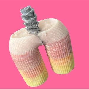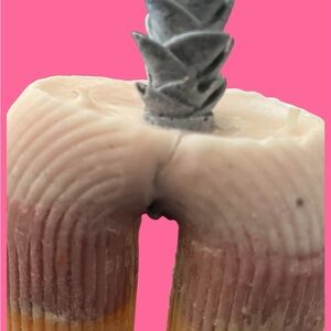Unique candle with a pineapple and sunset design. Features pink, yellow, and white/ light pink colors.