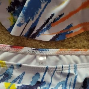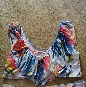 Bright splashes of color on a white background. Ruffle top. High waisted bottom. Gently used.