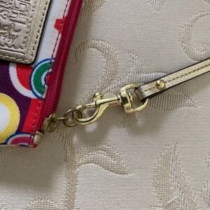 Genuine Coach canvas + leather wristlet bag. Bright colors in a monogrammed canvas print. Gold leather details and badging. In very good used condition! Measures 6.5" x 4.5"