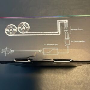 Brand new RGB LED strip light, still in its original packaging. The box is black with colorful graphics showcasing the LED strip's capabilities. The strip is described as having a flexible ribbon structure and is customizable. The box indicates features such as brightness adjustment, IR remote control, and cuttability. The LED strip is 3.3ft/10M 5050SMD, soft foldable, and has a high brightness LED chip. The box also includes an AC power adapter and RF controller box.