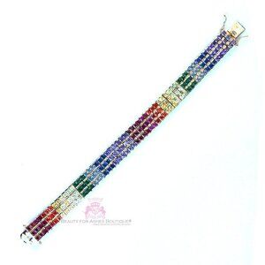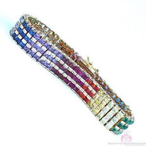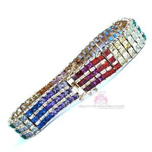 Beauty for Ashes Boutique's genuine rainbow cubic zirconias sparkle in the 14K Yellow Gold setting of this Tennis Bracelet. Princess cut top quality cz's in a channel setting in three rows, this rainbow represents God's Covenant made with us after the flood in Noah's day. It is the perfect reminder, at an affordable price! Tongue & Groove with double clasp closure. Durable 14K Yellow Gold Plated with 3mls over solid brass. Bracelet length is: 7.5", 1/2" wide. The colors of cubic zirconias are ruby red, garnet, dark amethyst, light amethyst, sapphire blue, sky blue, emerald green, peridot green, canary yellow, and bright red.