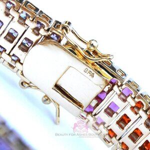 Beauty for Ashes Boutique's genuine rainbow cubic zirconias sparkle in the 14K Yellow Gold setting of this Tennis Bracelet. Princess cut top quality cz's in a channel setting in three rows, this rainbow represents God's Covenant made with us after the flood in Noah's day. It is the perfect reminder, at an affordable price! Tongue & Groove with double clasp closure. Durable 14K Yellow Gold Plated with 3mls over solid brass. Bracelet length is: 7.5", 1/2" wide. The colors of cubic zirconias are ruby red, garnet, dark amethyst, light amethyst, sapphire blue, sky blue, emerald green, peridot green, canary yellow, and bright red.