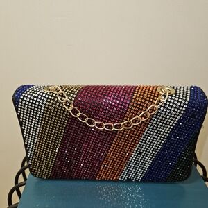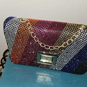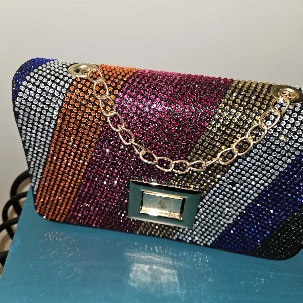 Dazzle with this stunning multicolor rhinestone bag, featuring a chic gold chain. Perfect for adding a pop of color to any outfit.
