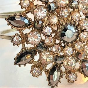 Bangle bracelet that opens halfway to put your wrist in. It has a large multicolor rhinestone penchant attached; very sparkly! 2.5” diameter.