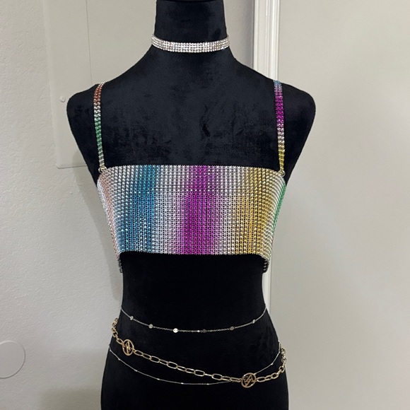 Dazzling multicolor rhinestone crop top. Features a vibrant array of colors for a bold look.