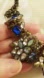 This multicolored rhinestone statement necklace features shades of blue, yellow, and clear rhinestones on an antiqued goldtone base. It measures 16" long and has a 3" extender. Excellent used condition.