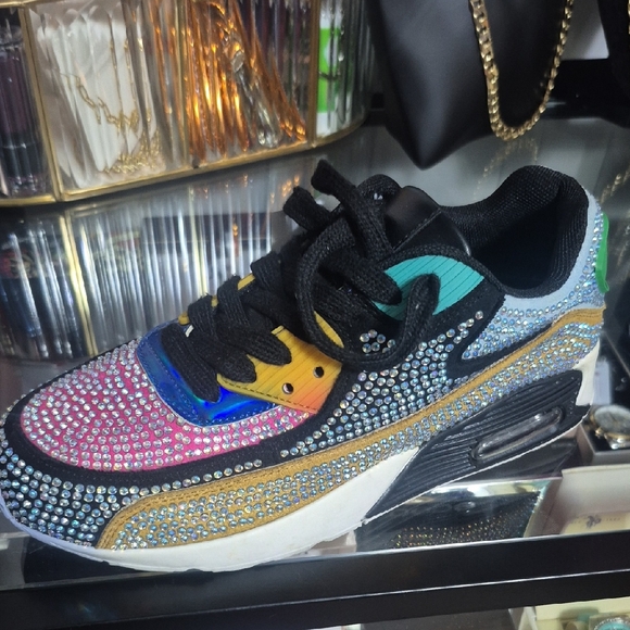 Eye-catching sneakers adorned with multicolor rhinestones. Features black, blue, yellow, and silver accents.