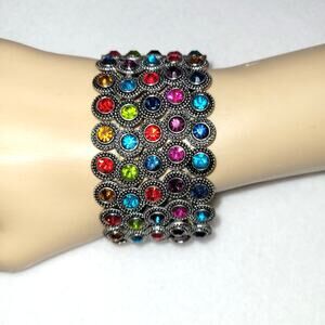Multicolor Rivoli Crystal Stretch Bracelet 1.5" Wide Statement Boho Glam Art Deco