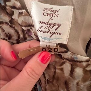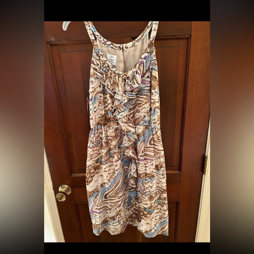 Stylish dress with ruffle details. Features a multicolor pattern with shades of brown, blue, and purple.