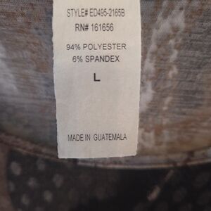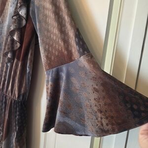 Stylish dress with ruffled details. Features a mix of brown, gray, and cream tones. NWOT
