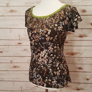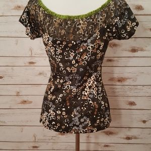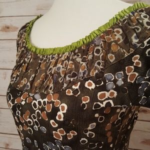 Gorgeous! Beautiful print featuring white, blue, brown, black accented with a gorgeous green silk neckline! 100% Silk sheer detailing around the top (front and back) adds that extra special detailing Etcetera is known for! Est 17" PTP, 19" Length. Main fabric content is 94% Rayon, 6% Spandex.